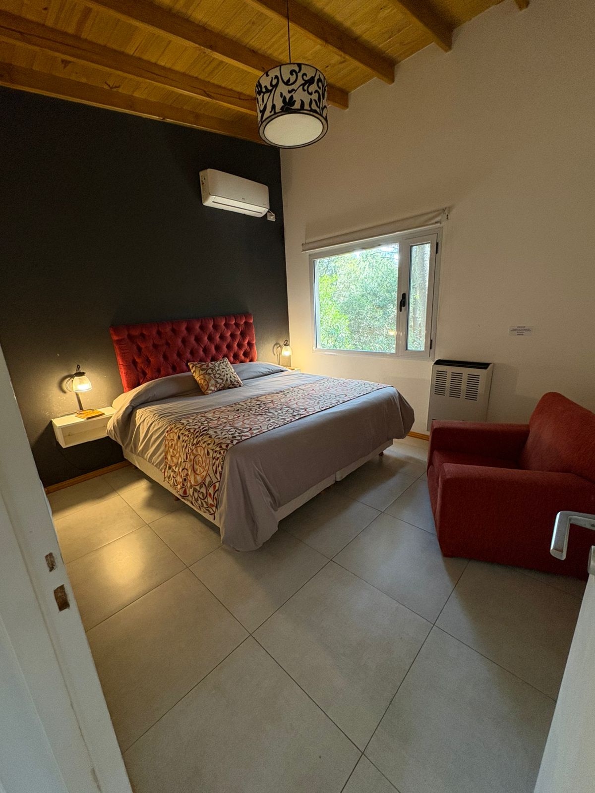 Dormitorio principal con cama somier, TV LED, aire acondicionado frio/calor, estufa tiro balanceado.